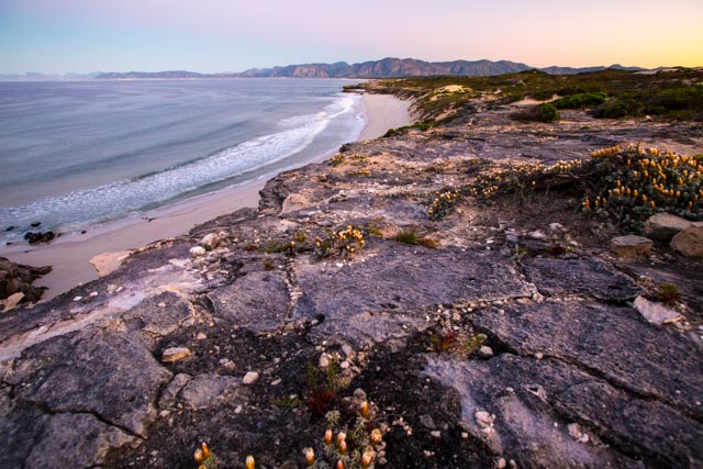 Akhona meinte, er sei noch nie so früh am Stand gewesen, aber er gab offen zu, dass es doch wunderschön sei. Er hockte sich auf einen Felsen und genoss einfach die Stimmung. Ich widmete mich dem Fotoapparat und sie (mit sie meine ich jeweils meine bessere Hälfte) dem Akhona und machte Samalltalk mit ihm. Es stellte sich heraus, dass er einmal ein perfekter Guide werden wird. Wir erfuhren viel über die Schule, die Region und das Leben in Südafrika. Höhepunkt waren sicher die Wale! Zwei vollführten (leider zu weit draussen, um Fotos zu machen, der Dödelfotograf hatte nicht alle Objektive dabei, das klingt ja fast schon wie „der hat nicht alle Tassen im Schrank“) ein komplettes Paarungsritual mit dem Klatschen der Schwanzflosse auf das Wasser oder standen mit dem Knopf nach unten im Wasser und strecken die Schwanzflosse senkrecht aus dem Wasser. Hinzu kam das Winken mit den seitlichen Brustflossen. Es war einfach nur schön! Nach diesen Eindrücken teilten wir drei uns die Lunchbox. Gipfeli mit Lachs, Käse, Schinken, einfach alles was man so in der früh am Stand braucht. Und das an einem so tollen Ort.