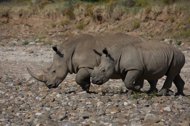 Etwa um 14.00 ging es los. Mit was wohl? Mit Essen und einer Kennenlernrunde. Ein Paar aus Österreich und ein Pärchen aus England waren ebenfalls auf dem Tripp dabei sowie unser Guide Jannie. Nach dem Essen ging’s mit dem Jeep zuerst mal auf Safari. Nachdem am vergangenen Tag der Ertrag in Sachen Tieren nicht so erfolgreich war, wurden wir gleich überhäuft mit Nashörnern, Zebras, Giraffen, Elandantilopen, wunderschönen Vögeln und vielem anderen Getier. Schon beim ersten Flussbett trafen wir auf die ersten Nashörner! Begleitet von wunderbaren Vögeln im tollen Licht.